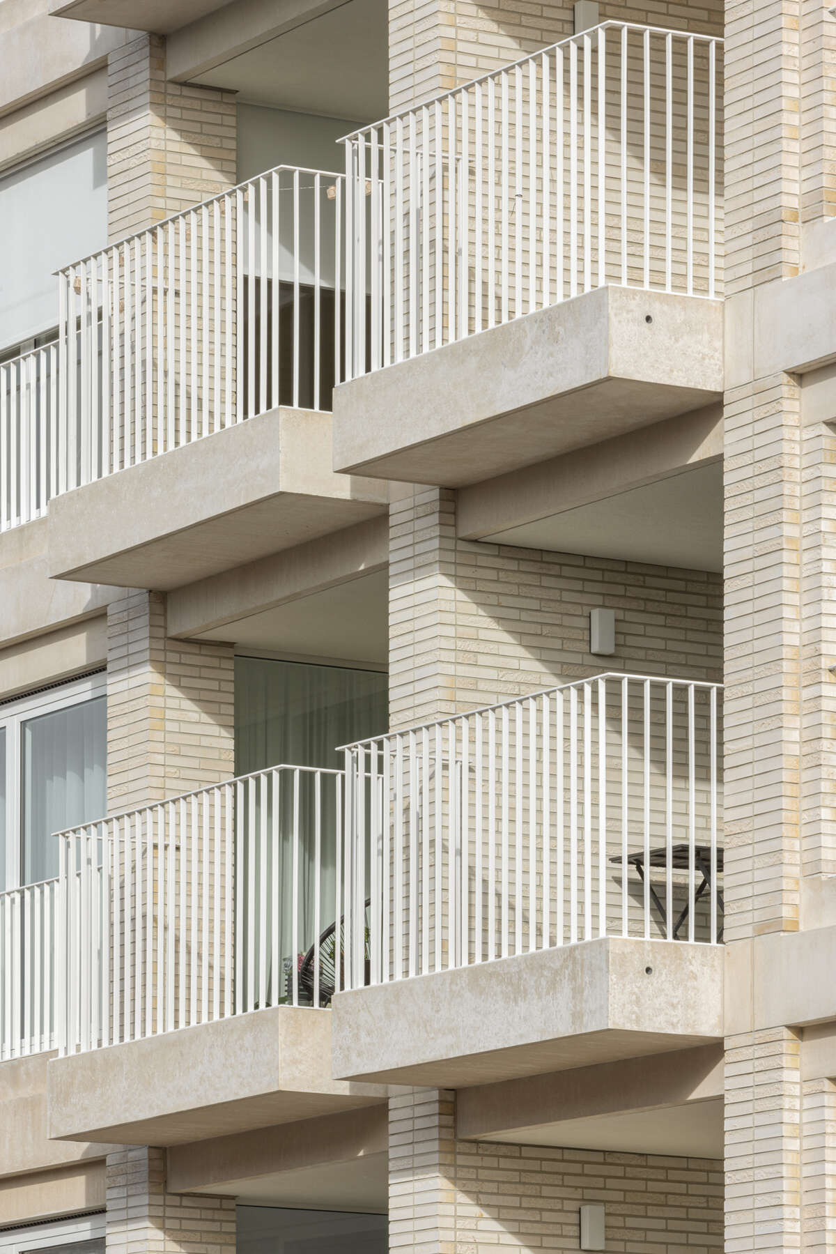 Large windows between the protruding columns ensure optimal daylight enters the living spaces. The articulation of the vertical joint in the brick bond extends into the horizontal concrete bands, creating a facade that is modestly versatile and seamlessly connects with the adjacent buildings.