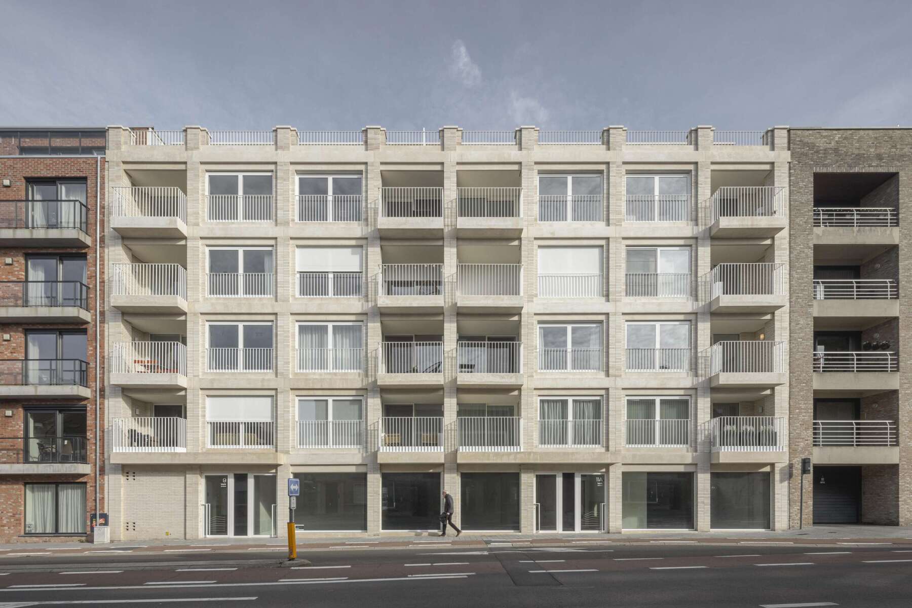 The project envisions the redevelopment of a former factory site on the corner of Zonnebeekseweg and Meenseweg with 26 apartments, divided between 2 buildings, flanking a parking in the center of the site. A commercial plinth is accessible from the Meenseweg. The facade consists of a rhythmic grid of horizontal bands of concrete and brick.